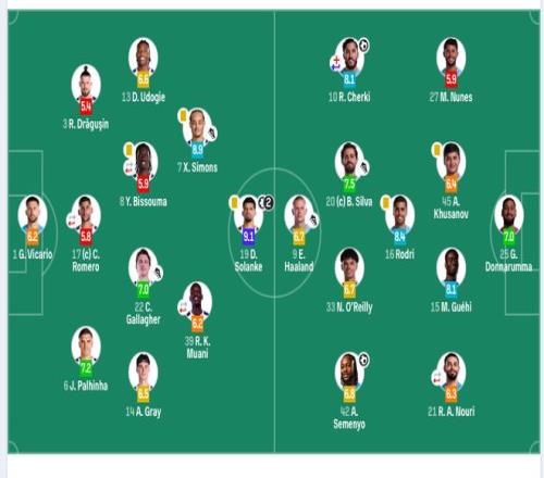 曼城首发:25-多纳鲁马、27-努内斯、45-胡桑诺夫、15-格伊、21-艾特-努里(68’14-尼科·冈萨雷斯)、16-罗德里、20-B席(88’47-福登)、33-奥赖利、42-塞梅尼奥、10-谢尔基(68’4-赖因德斯)、9-哈兰德。